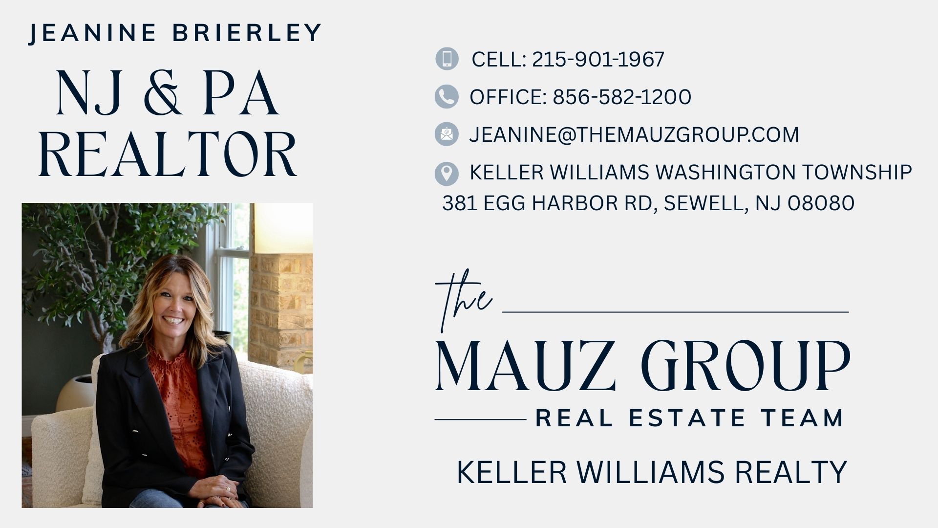 Jeanine Brierley at The Mauz Group, 381 Egg Harbor Dr. Sewell, NJ 08080 (856) 302-4003